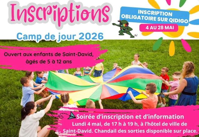 Les inscriptions pour le camp de jour 2026 débuteront ce lundi 4 mai 2026 et se termineront le 28 mai 2026 via le portail Qidigo https://www.qidigo.com/login